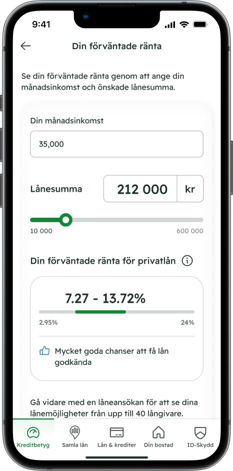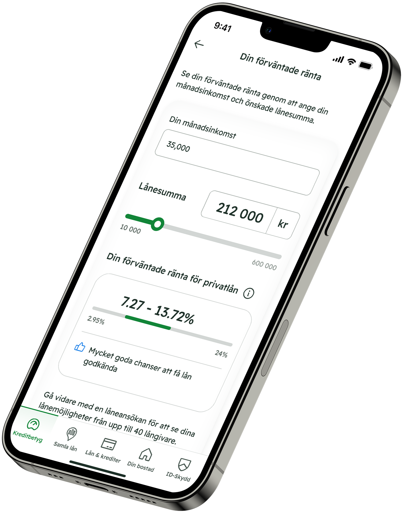Alla uppgifter som visas i appen gällande kreditbetyg, kreditengagemang och ID-skydd hämtas från UC AB.